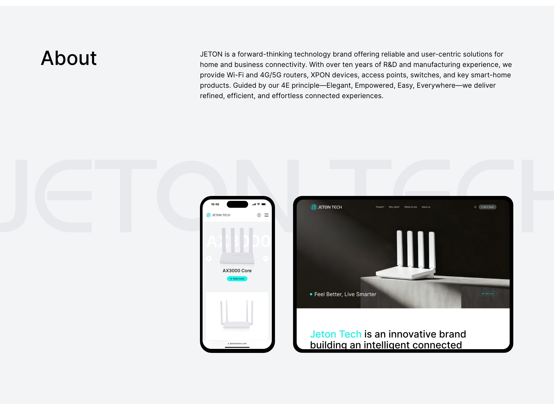 Jeton Tech is a forward-thinking brand delivering reliable, smart, customer-focused networking and home solutions.